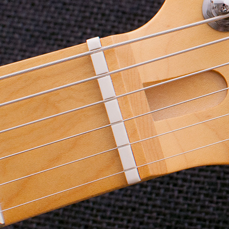 We use "Boneite," a synthetic bone nut, that is more consistent than natural bone, on all Reverend instruments. It reduces friction, allowing the strings to slide through the nut slots smoothly, improving tuning stability.