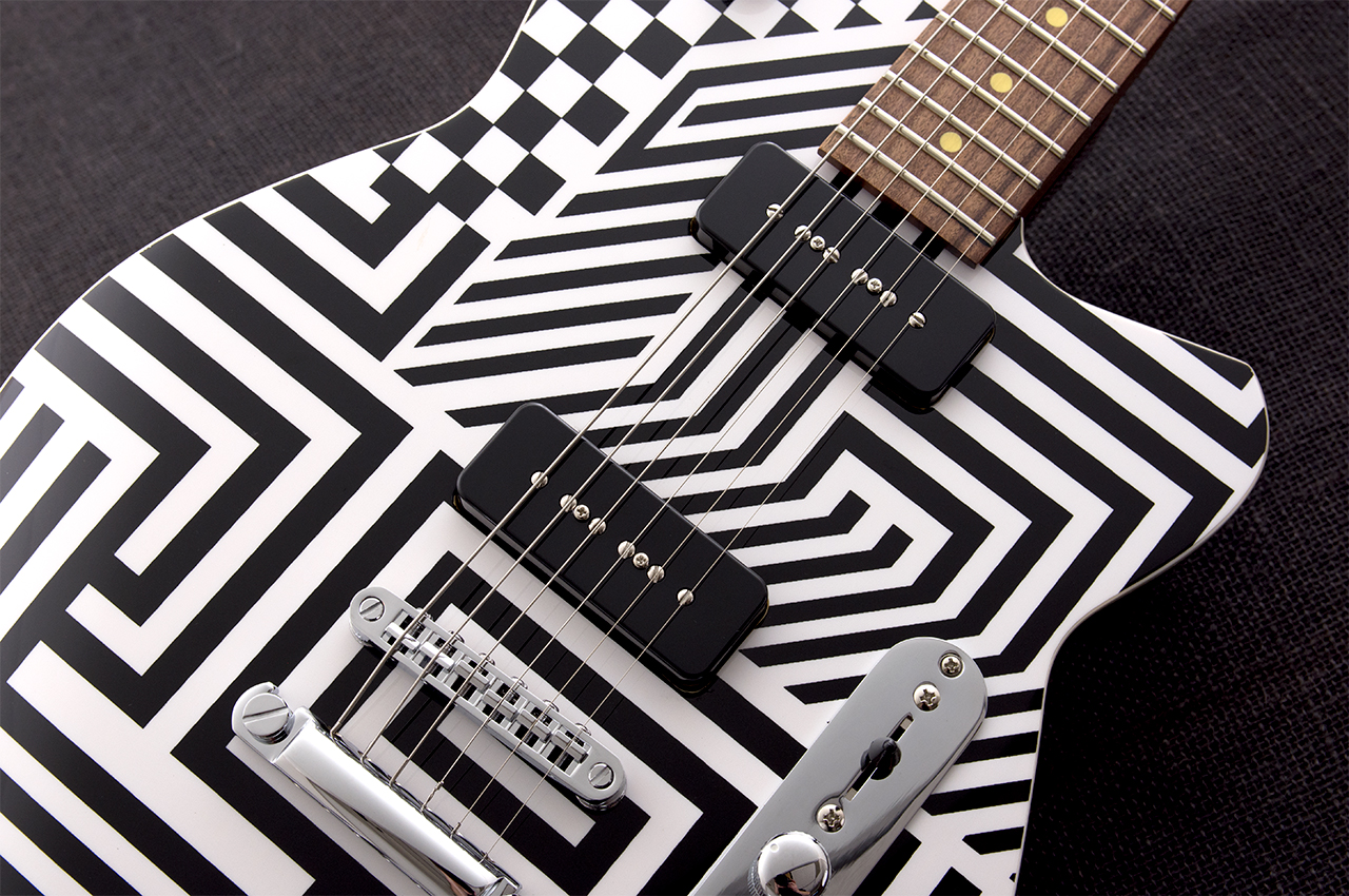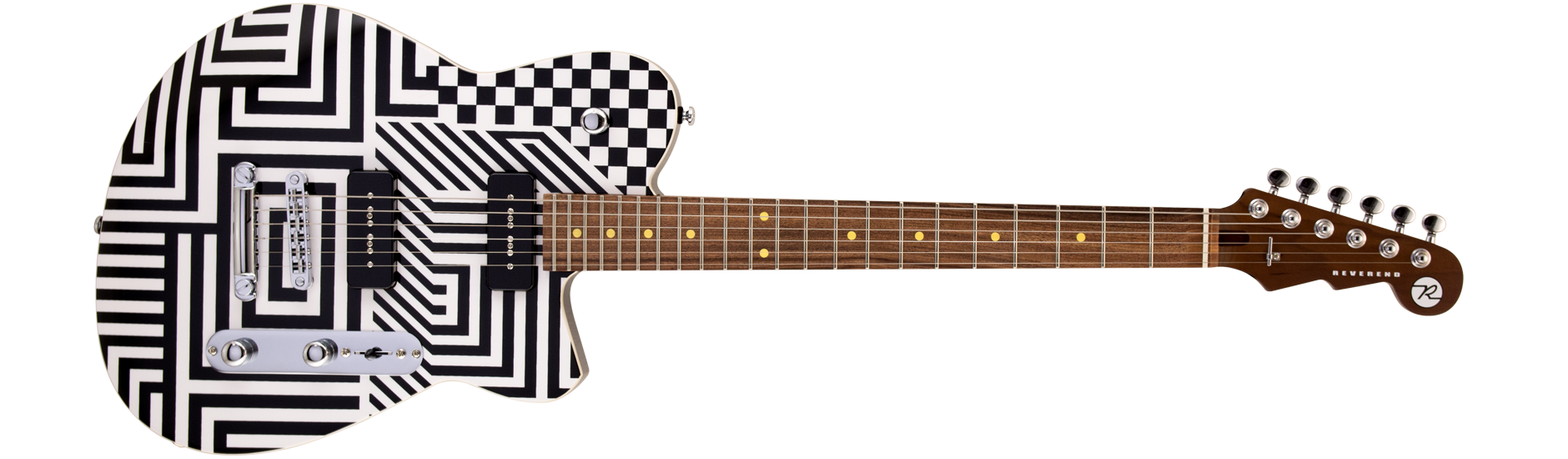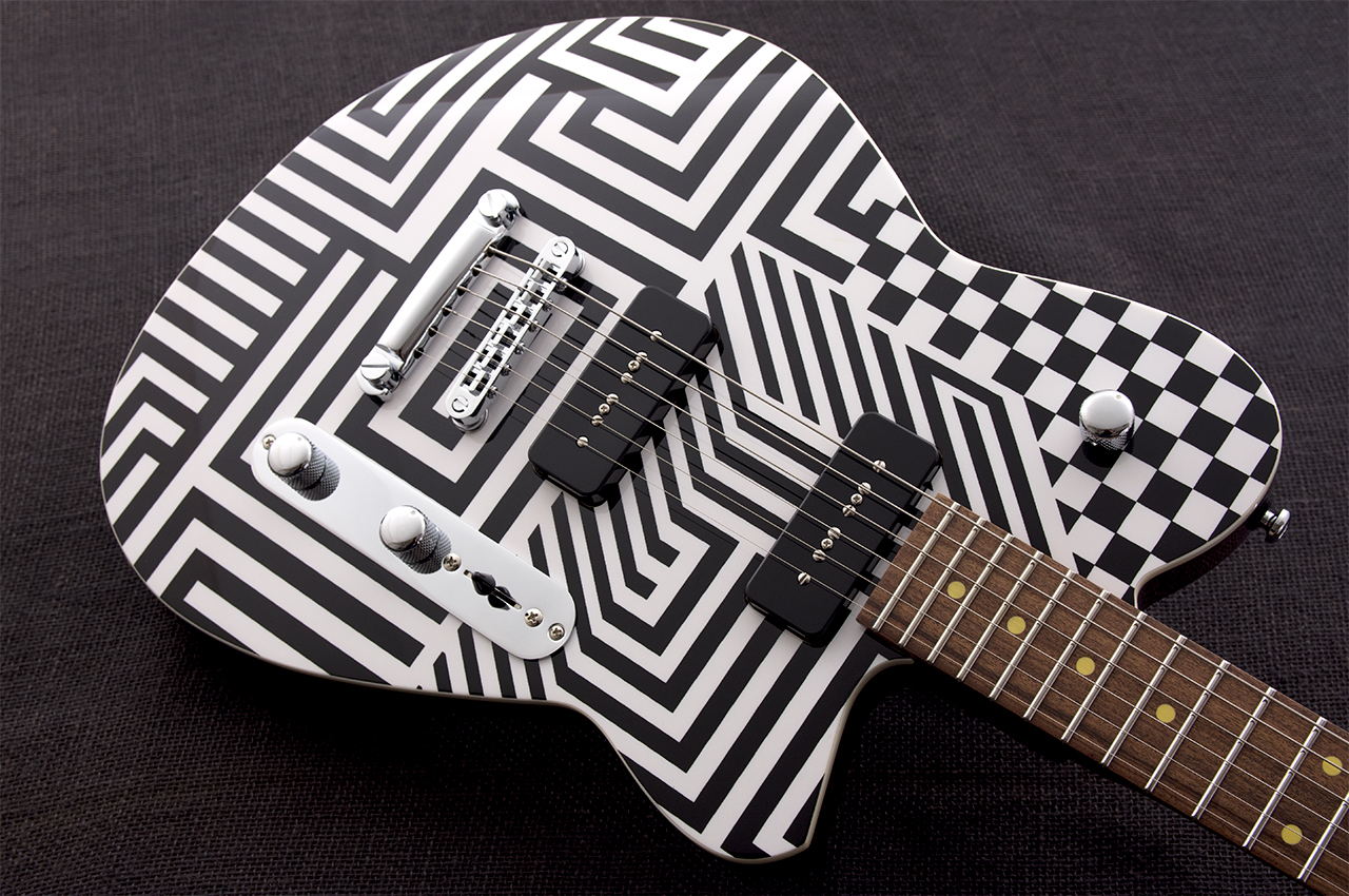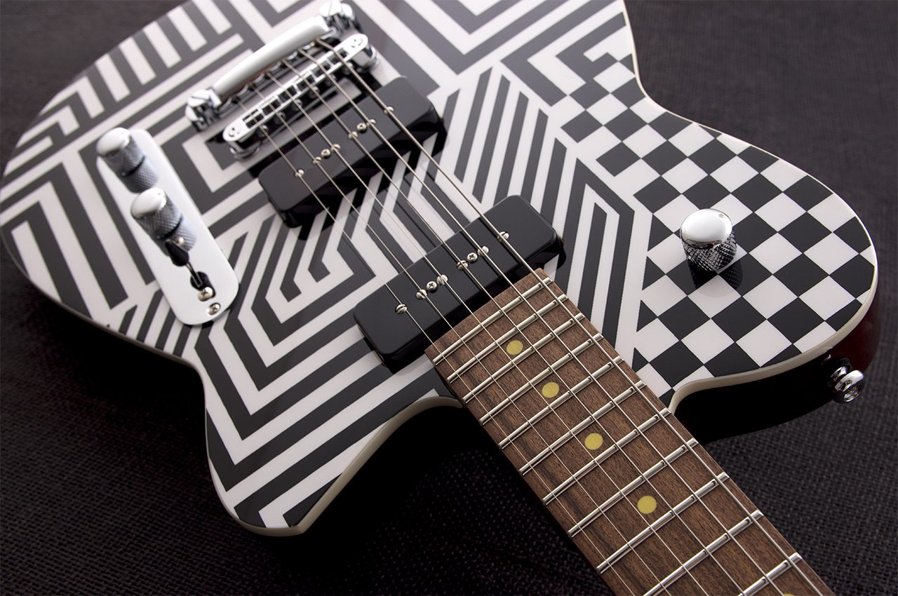 The body of the JW-1 is topped with a graphic from textile artist April Camlin’s “Optic Interruption,” while the back and sides are Midnight Black to highlight the pattern. She adapted the pattern for the project, and Reverend designer Joe Naylor matched it to the Charger HB-style guitar.