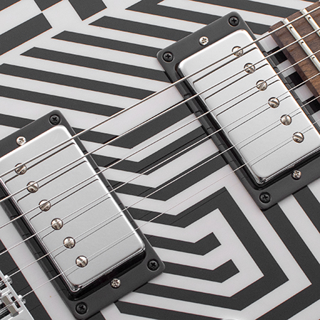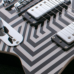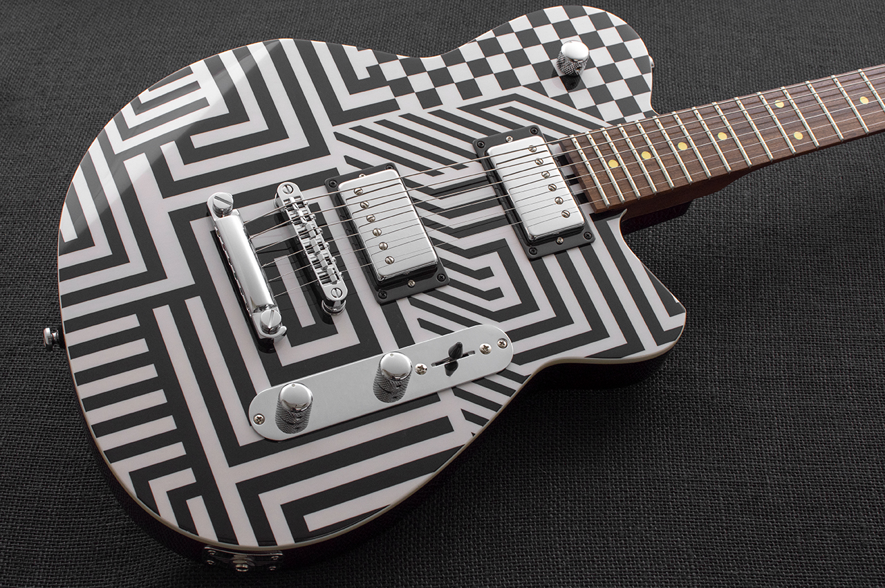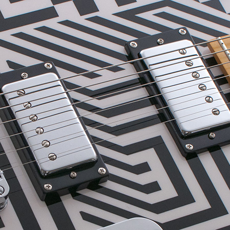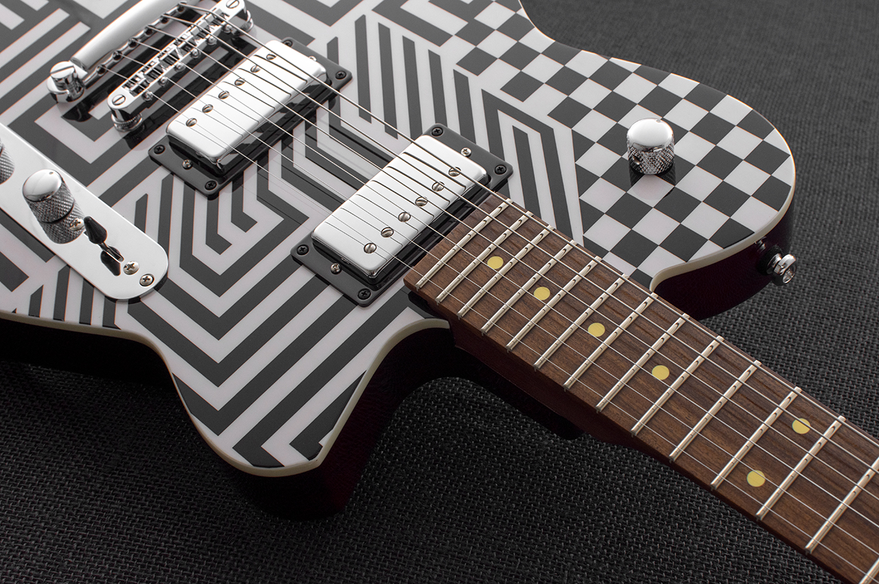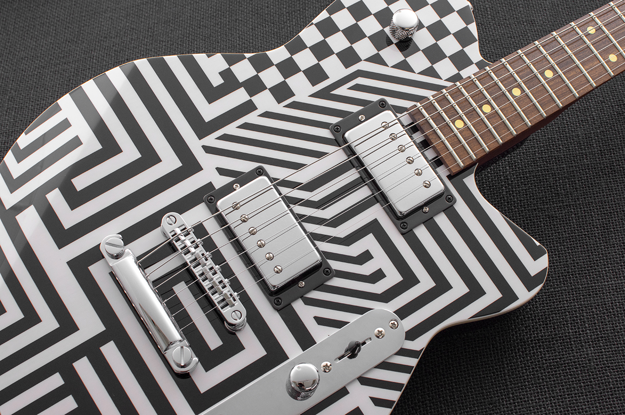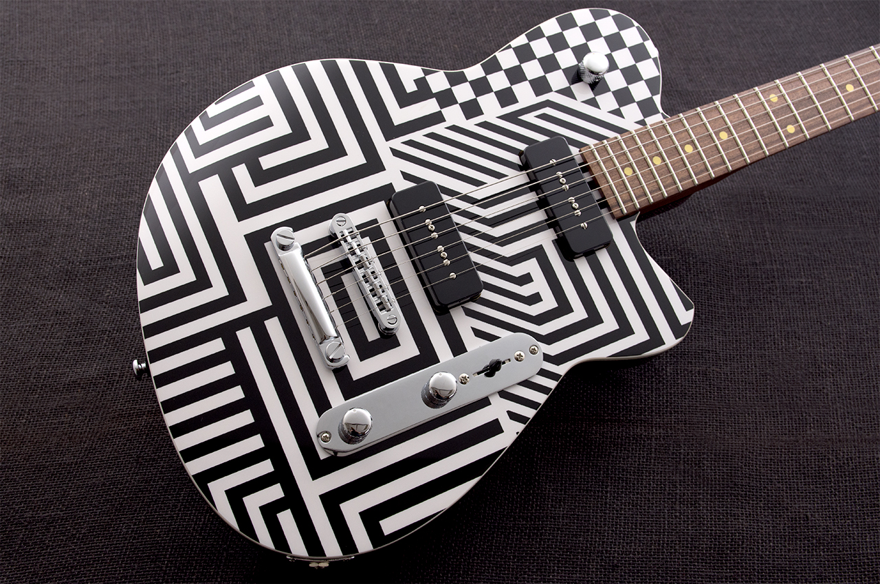 The body of the JW-1 is topped with a graphic from textile artist April Camlin’s “Optic Interruption,” while the back and sides are Midnight Black to highlight the pattern. She adapted the pattern for the project, and Reverend designer Joe Naylor matched it to the Charger HB-style guitar.